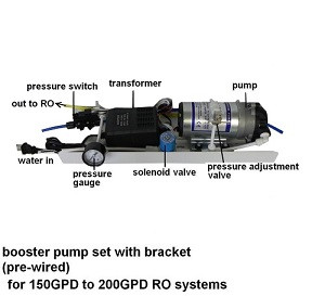 This water booster pump is designed to be used for 150GPD to 200GPD Reverse Osmosis water systems.  It is pre-wired and pre-installed on a steel bracket so that the installation would be easy and neat. It also includes a pressure adjusting valve which you can adjust the boost pressure.
