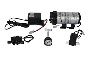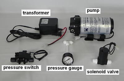 | This is Aquatec 6800 booster pump SET + bonus pressure gauge with 110V/60hz transformer, solenoid valve, and pressure switch. ( we have already wired up the electrical components) Model: SET-68 AQUATEC CDP 6840-2J03-B224 SET, Made in USA Input/output: 1/4" quick connect The pump is a 24VAC pump set, which includes the pump, solenoid valve, pressure switch, transformer to 110V/60hz, and bonus pressure gauge, extra tubing. (all electrical components are wired up) Condition: NEW (one-year factory warranty by Aquatec) This pump is usually used to boost water supply pressure to a Reverse Osmosis water system. This pump is good for RO systems that are up to 100GPD capacity. If your water supply pressure is below 40psi, you should add this pump to your RO sytem. Using this pump set the pump can turn on/off automatically. The solenoid valve is an electronic shut-off valve that shuts off the water when it is switched off by the pressure switch. The pressure switch is used to shut off the pump and solenoid valve when the output pressure (or pressure tank pressure) reaches 55 psi and switch back on when the pressure falls below 40 psi. This switch is adjustable +/-5 psi. The bonus pressure gauge is usually connected after the booster pump to monitor the operating pressure. Note: We have already pre-wired the electrical connections. We have also included flow diagram of how to connect to your existing RO system and an electrical wiring diagram. NOTE: we also carry 220V/50hz European transformers for extra charge. |