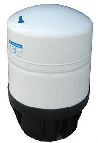 A pressure tank is used in RO systems to accumulate water and provide pressure when dispensing the purified water. It has a water bladder inside the tank that holds the purified water, and outside the bladder it contains compressed air. So when you dispense water, the compressed air squeezes the bladder and forces the water out with pressure. You can also connect several tanks together to provide more water.