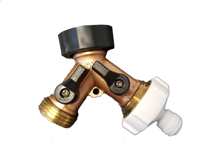 * This Y-adapter splits up your existing garden hose valve or laundry room hose valve into two outputs. It has a 3/4" female hose thread on one end and two 3/4" hose male thread on the other two connections. This item also includes a quick connect garden hose adapter to 1/4" tubing.